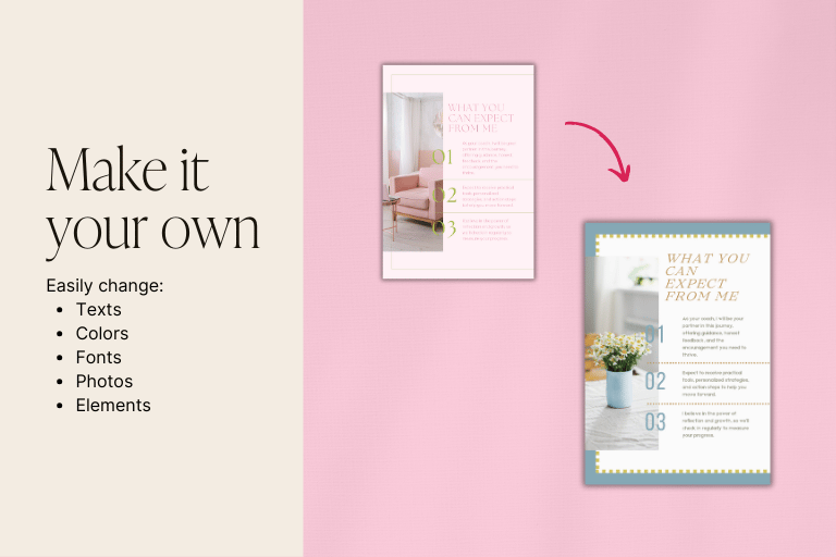 Effortlessly adjust the colors, fonts, texts, photos, and design elements to match your branding, ensuring a cohesive and personalized look for your client materials.