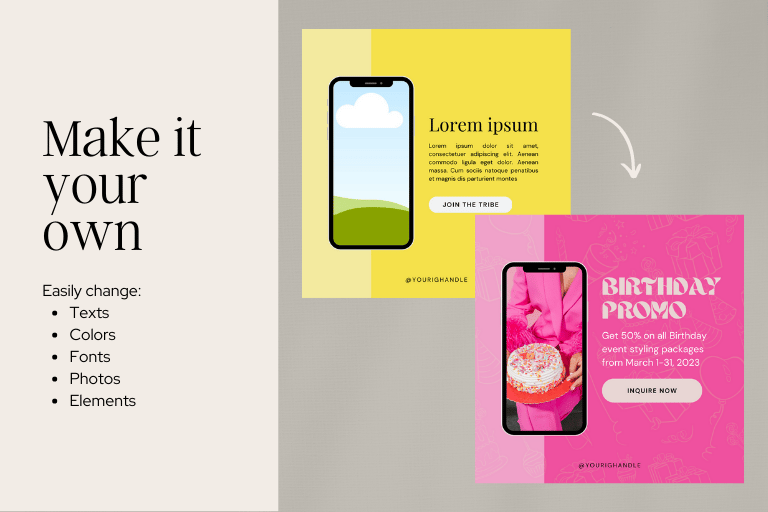 Easily change texts, colors, fonts, photos and design elements to suit your branding/brand's visual identity.