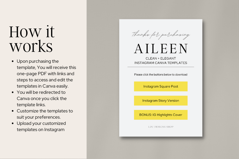 - Upon purchasing the template, You will receive a one-page PDF with links and steps to access and edit the templates in Canva easily.